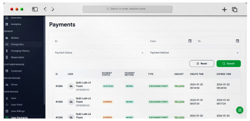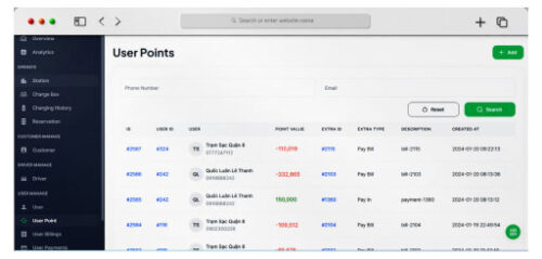 Ứng dụngq quản lí sạc thông minh giúp người dùng dễ dàng quản lý, theo dõi và thanh toán chi phí sạc xe thông qua ứng dụng di động.